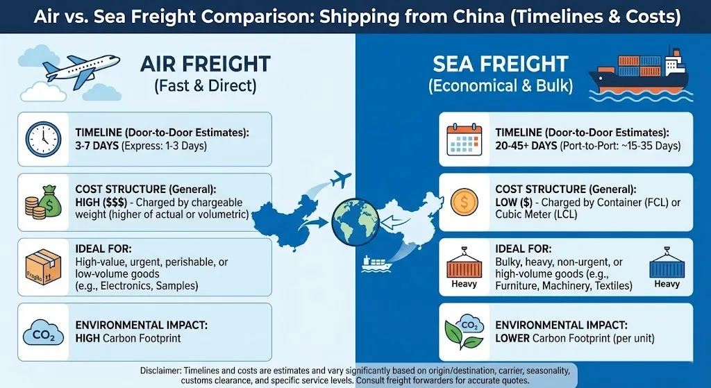 (Above: Air vs Sea freight comparison infographic for shipping from China, highlighting timelines and costs)